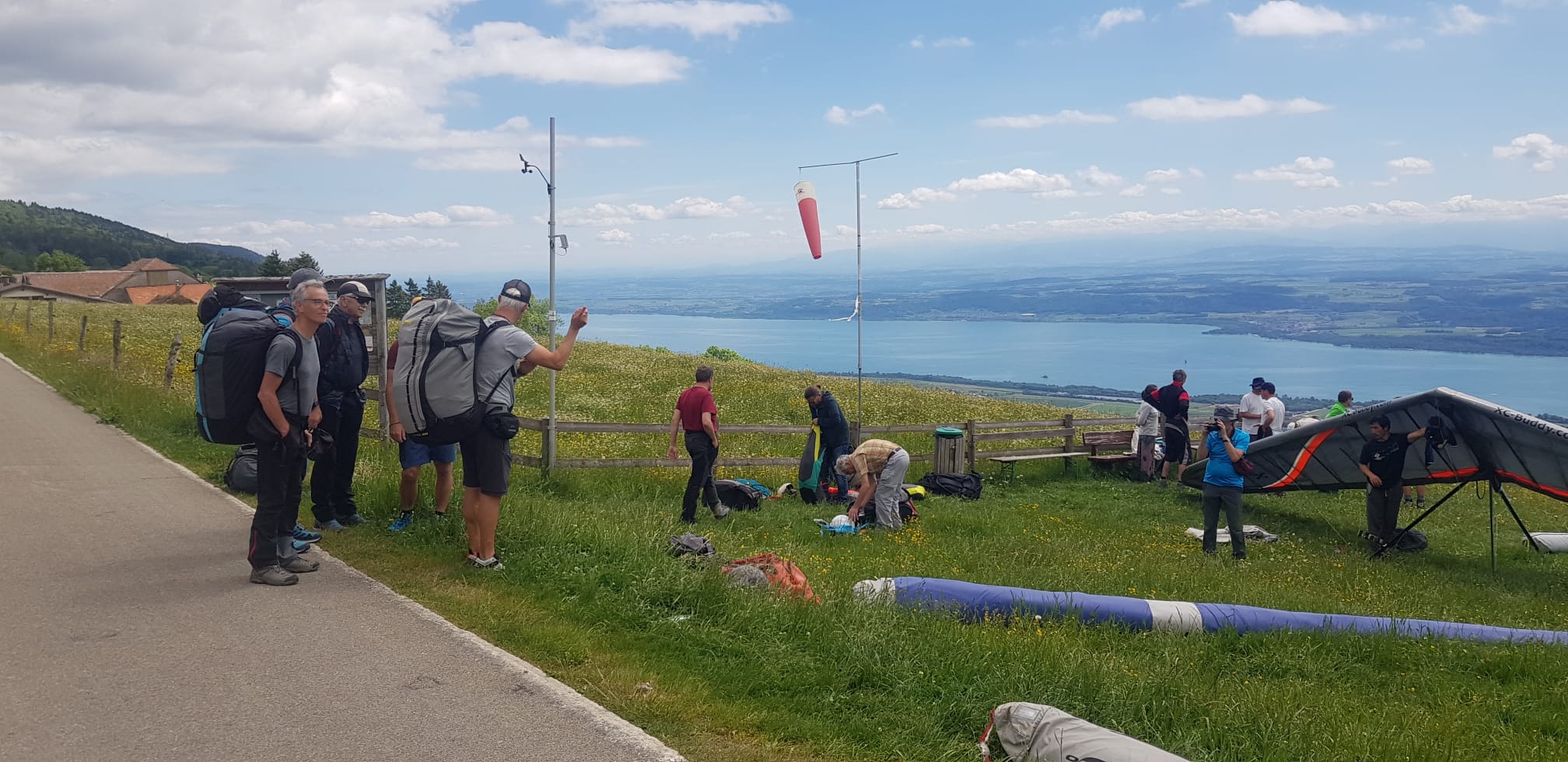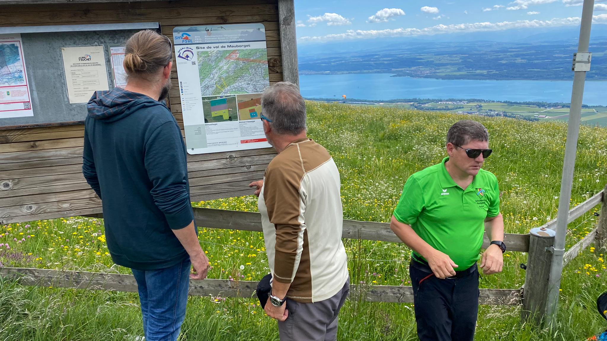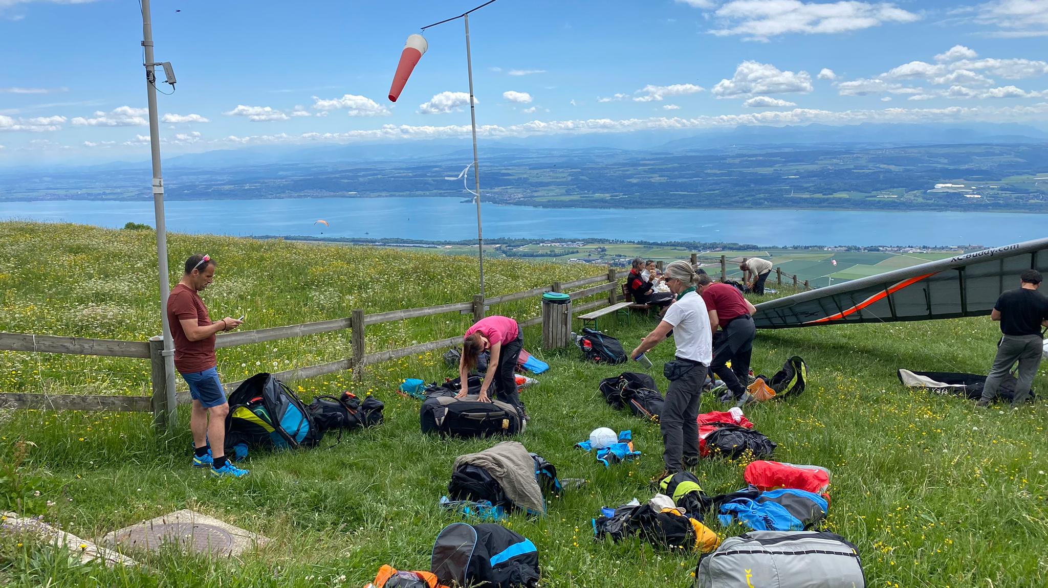 An Auffahrt fuhren wir individuell mit Bus, Wohnmobil oder Personenwagen nach Orbe zum Hotel des Mosaïques. Nach einer kurzen Begrüssung und Zimmerbezug wollten die Piloten auf den Berg. Mit Bus und PW ging es nach Mauborget an den Startplatz. Dort angelangt stellten wir fest, dass der Wind wechselte, es aber Startbar ist. Die Packsäcke wurden entleert und zwischen den Einheimischen Deltas und Schirmen startklar gemacht. Nach einer halben Stunde war die Blumenwiese leer und alle in der Luft. Thermisch ging es auch hoch doch der Wind störte auf der ganzen Länge. Mit unterschiedlichen Taktiken wurde auch längere oder kürzere Flüge getätigt.         >> Mehr